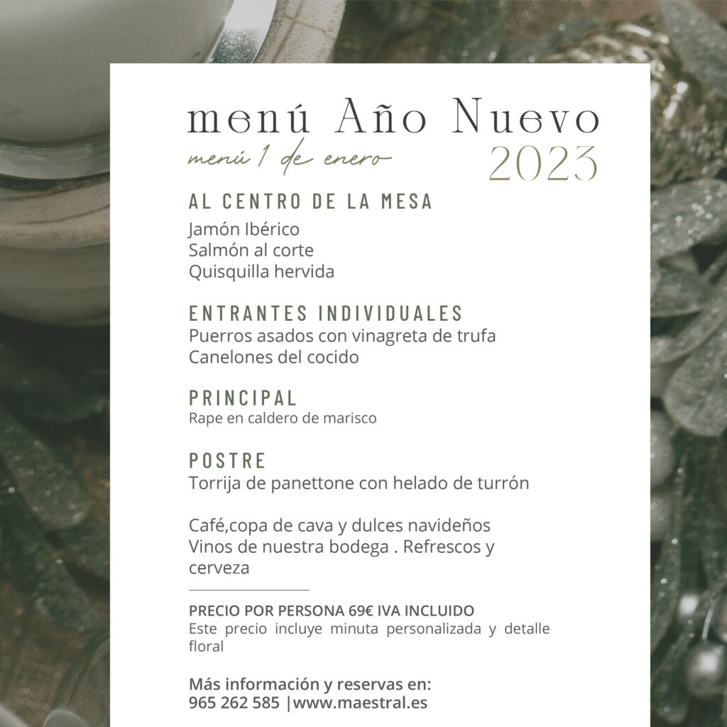 En Maestral sabemos que cada ocasión es especial si la celebras con los seres queridos y por eso hemos elaborado un menú especial de Año Nuevo con el que disfrutaréis del primer día del 2023 entre manjares y en un ambiente elegante y distendido.